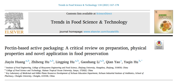 近日,由公司作为唯一通讯单位的综述文章“果胶基活性包装的制备、物理性质及其在食品保鲜中的新应用”在国际食品领域顶级期刊《Trends in Food Science & Technology》公开发表。