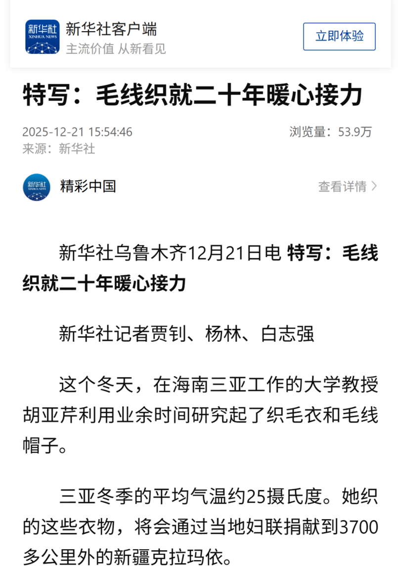 新华社近日报道了海南省妇联组织的“恒爱行动——百万家庭亲情一线牵”公益活动,其中特别以公司太阳成集团tyc9728胡亚芹教授作为开篇典型事例,讲述了她利用工作之余为新疆克拉玛依儿童亲手编织爱心毛衣的感人故事。这一报道在全国范围内展现了公司教师服务社会、奉献爱心的责任担当。