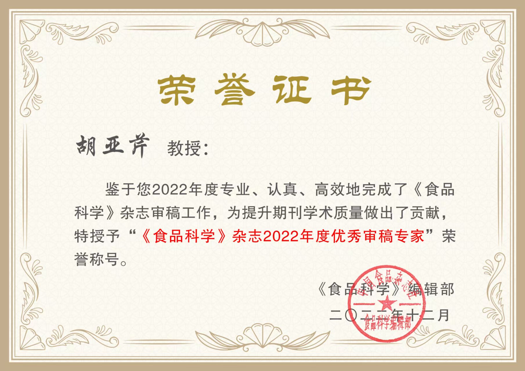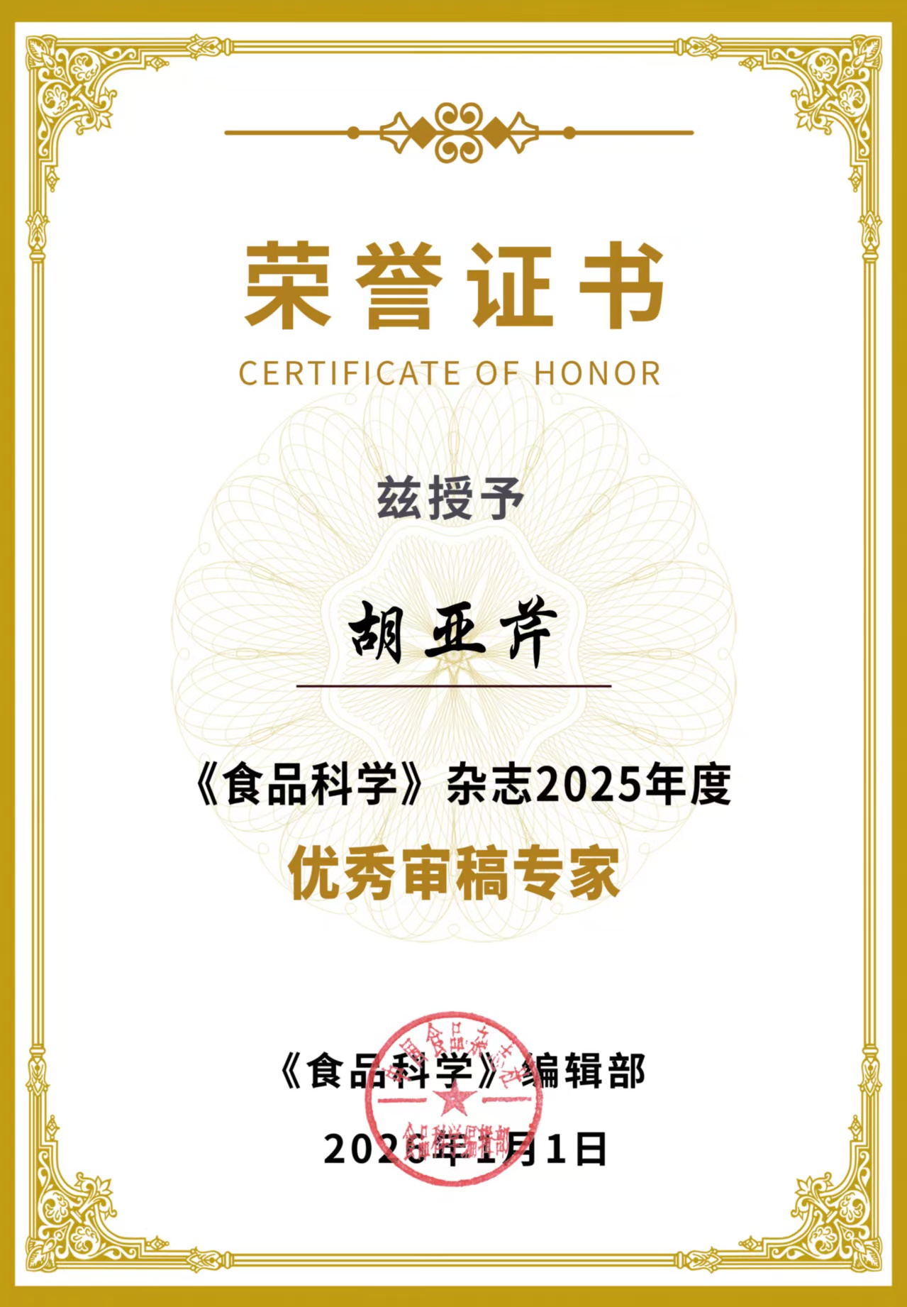 太阳成集团tyc9728胡亚芹教授荣获《食品科学》杂志2025年度“优秀审稿专家”称号